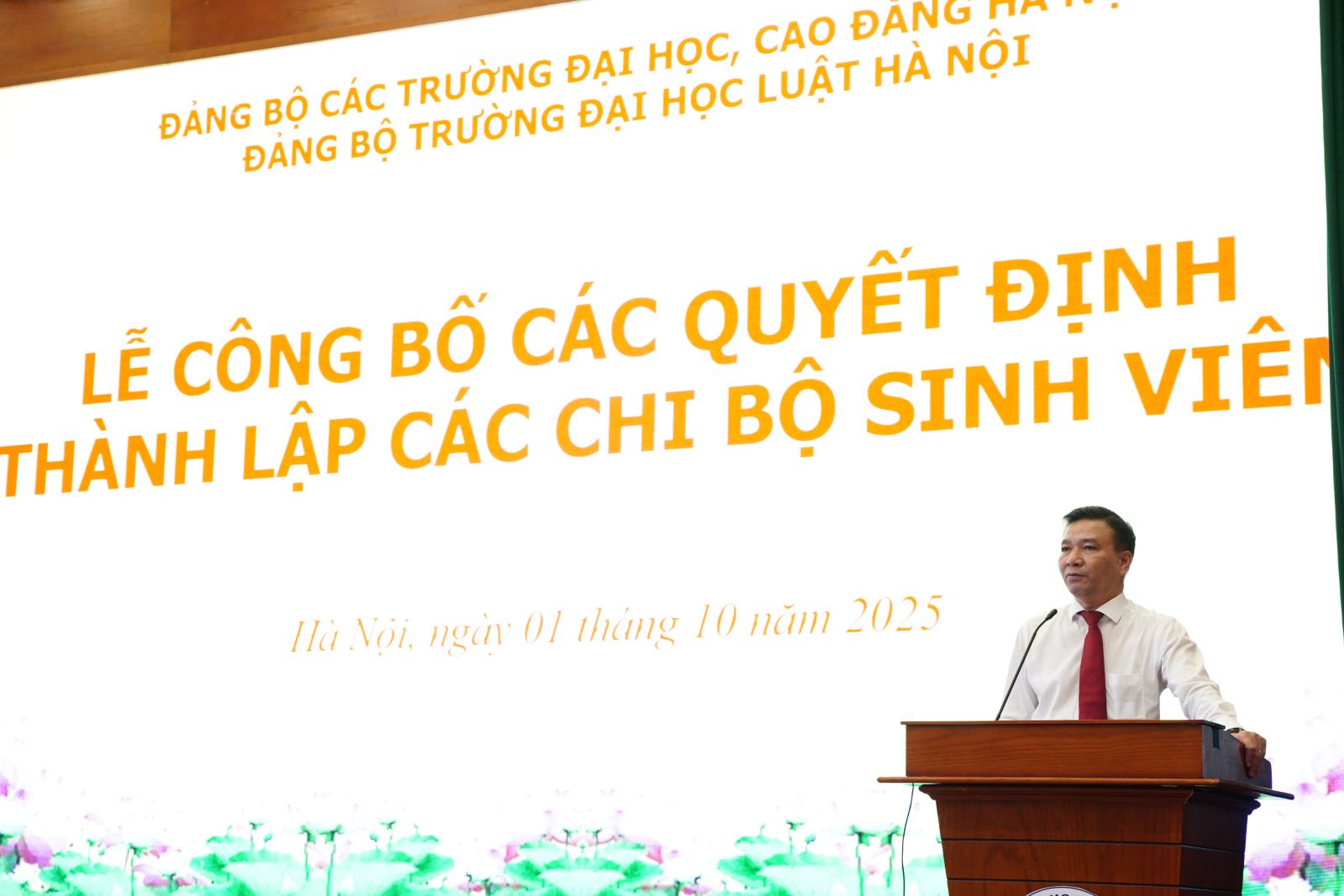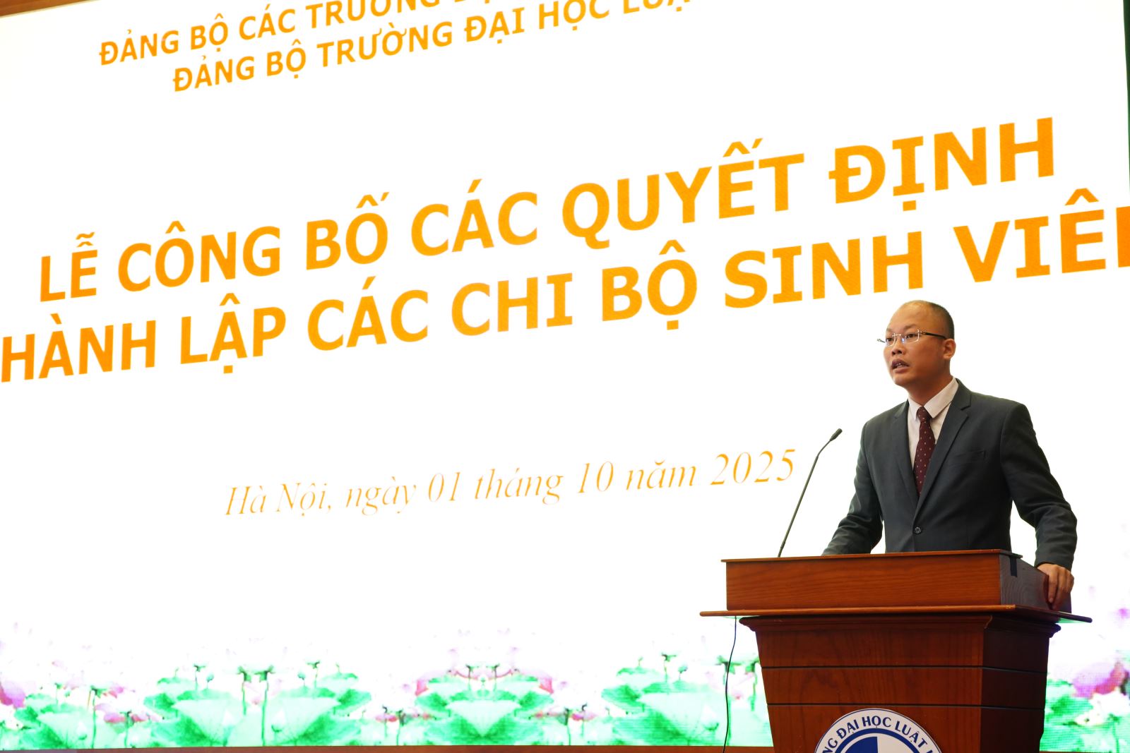 Mở đầu buổi lễ, đồng chí Nguyễn Thị Kim Ngân, Phó Ban Tổ chức Đảng ủy, Trưởng phòng Phòng Đào tạo sau đại học đọc các Quyết định. Theo Quyết định, thành lập Chi bộ Sinh viên số 1 trực thuộc Đảng ủy Trường Đại học Luật Hà Nội, gồm 129 đảng viên, trong đó đồng chí Đậu Công Hiệp, Giảng viên Trung tâm thực hành Pháp luật là Bí thư chi bộ. Thành lập Chi bộ Sinh viên số 2 trực thuộc Đảng ủy Trường Đại học Luật Hà Nội, gồm 128 đảng viên, trong đó đồng chí Nguyễn Ngọc Dung, Giảng viên, Phó Bí thư Đoàn Trường, Chủ tịch Hội sinh viên là Bí thư chi bộ. Thành lập Chi bộ Sinh viên số 3 trực thuộc Đảng ủy Trường Đại học Luật Hà Nội, gồm 117 đảng viên, trong đó đồng chí Dương Hiểu Phong, Giảng viên, Bí thư Liên chi đoàn Khoa PL Kinh tế, Ủy viên Ban Thường vụ Đoàn Trường là Bí thư chi bộ. Thành lập Chi bộ Sinh viên số 4 trực thuộc Đảng ủy Trường Đại học Luật Hà Nội, gồm 110 đảng viên, trong đó đồng chí Trần Trọng Đại, Giảng viên, Bí thư Đoàn Trường là Bí thư chi bộ.