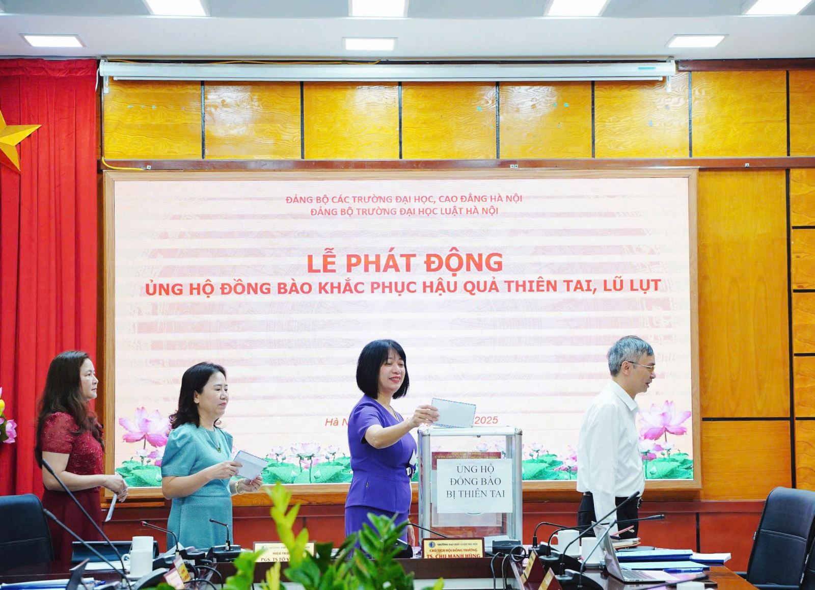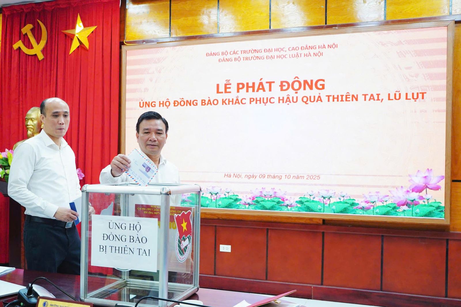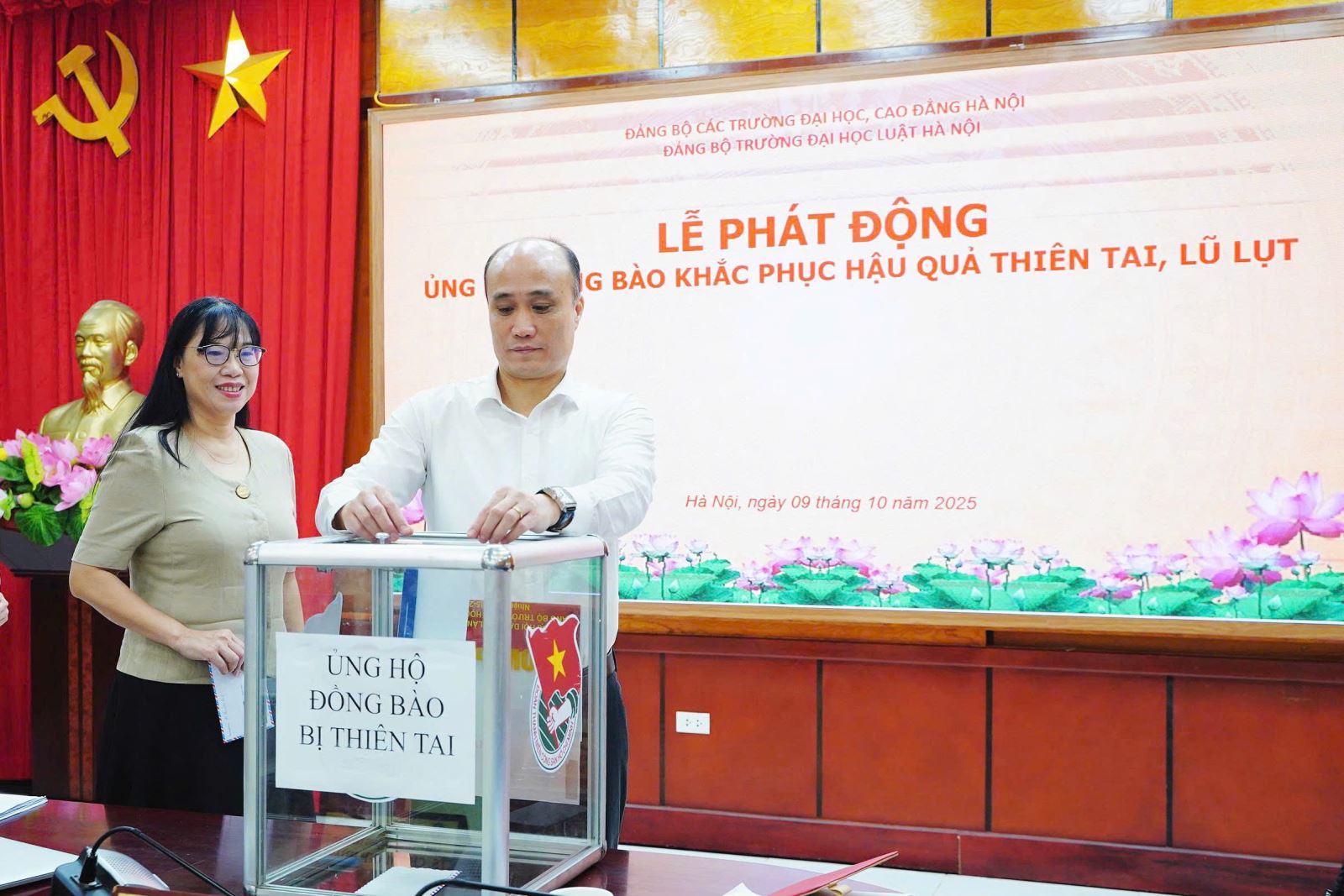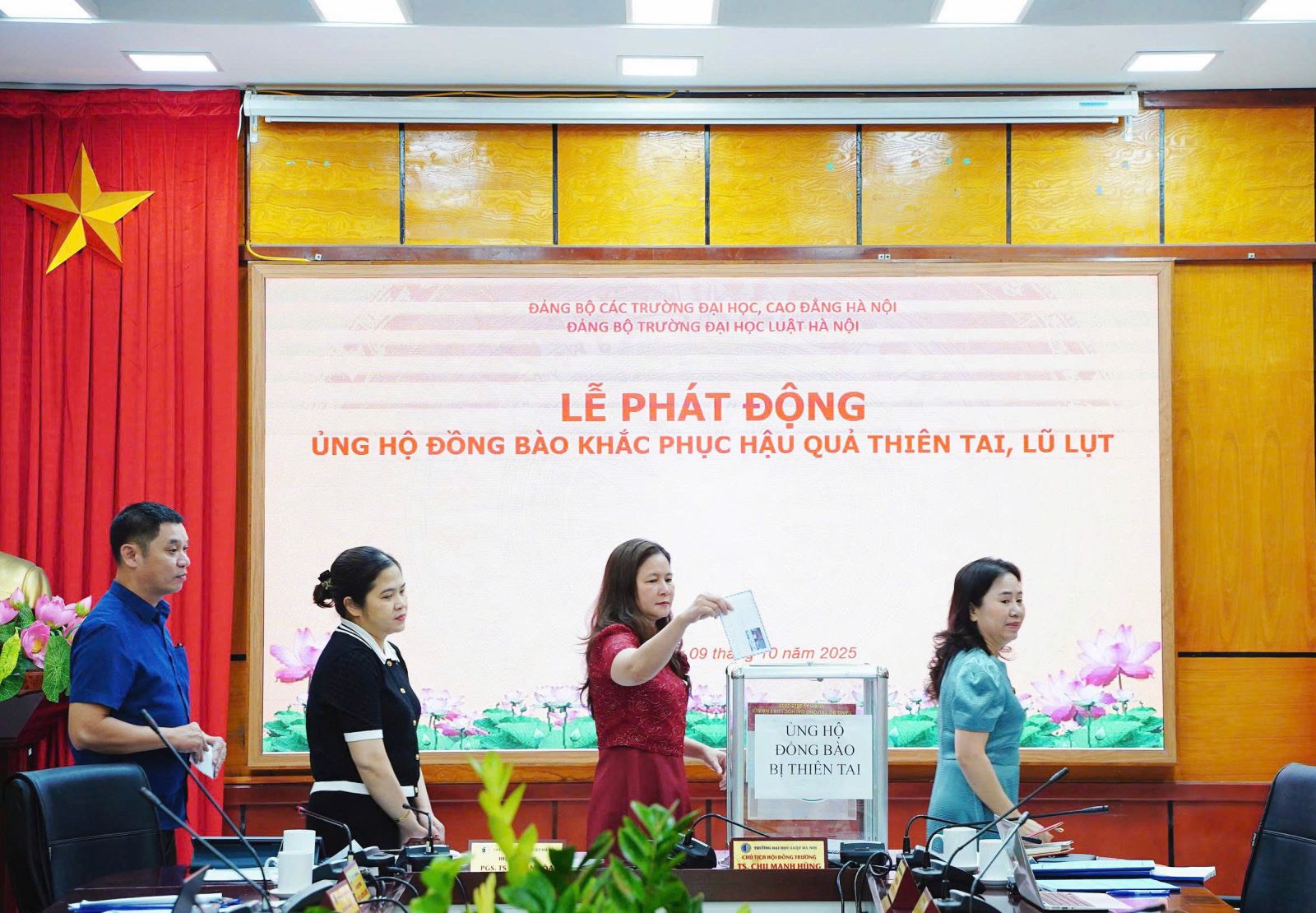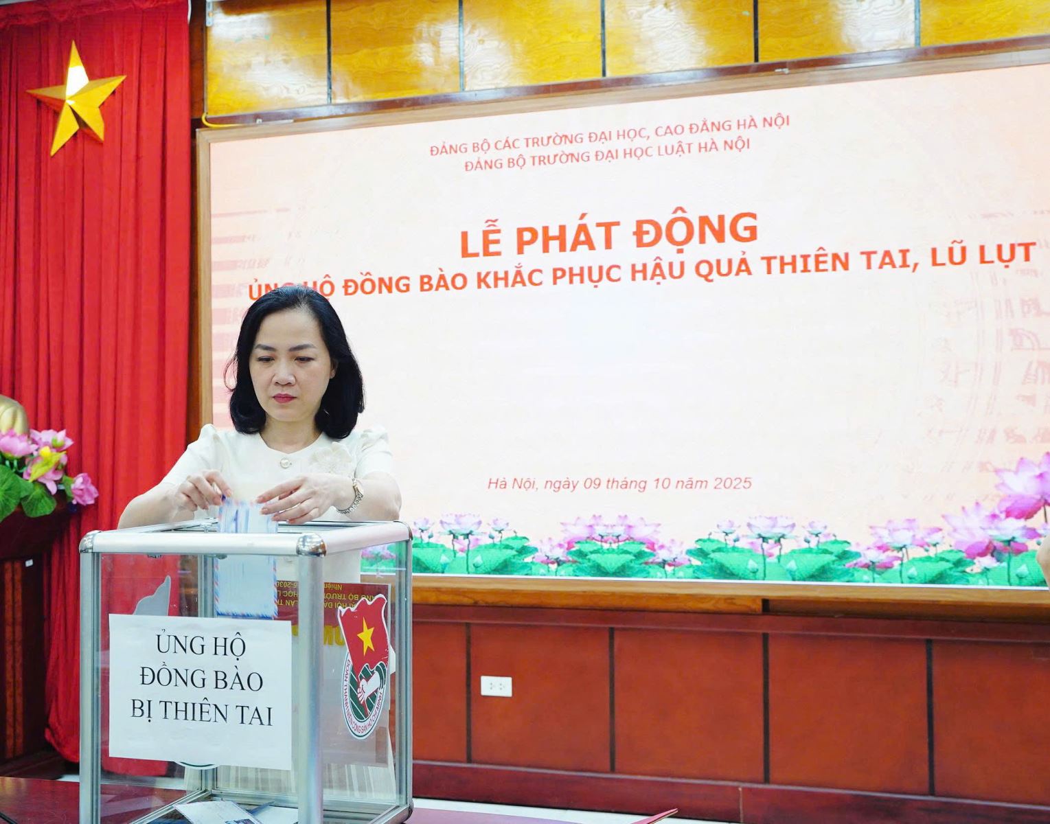 Sáng ngày 09/10/2025, trước tình trạng mưa bão, sạt lở, ngập lụt vừa qua đã gây hậu quả nghiêm trọng về người và tài sản,Trường Đại học Luật Hà Nội đã phát động chương trình ủng hộ đồng bào khắc phục thiệt hại do cơn bão số 10 gây ra.