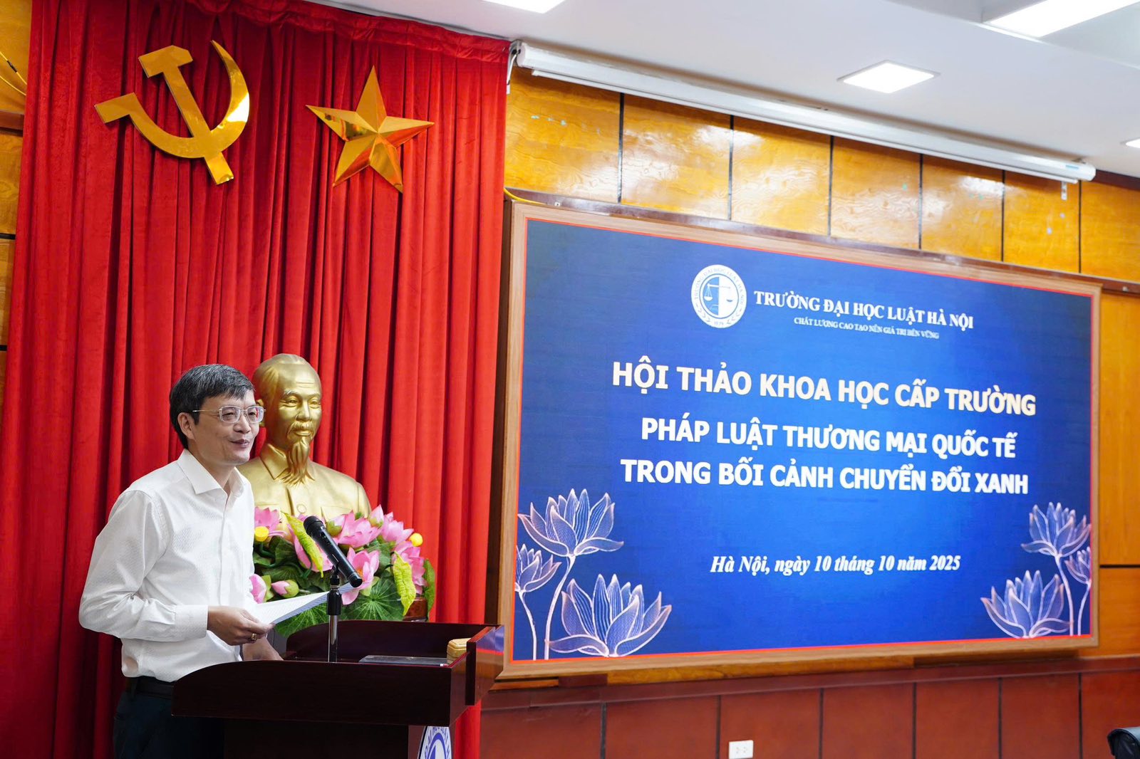 Sáng ngày 10/10/2025, Khoa Pháp luật quốc tế, Trường Đại học Luật Hà Nội đã tổ chức thành công Hội thảo khoa học cấp Trường với chủ đề “Pháp luật thương mại quốc tế trong bối cảnh chuyển đổi xanh”. Hội thảo được chủ trì bởi PGS.TS. Nguyễn Bá Bình - Phó Hiệu trưởng Nhà trường và TS. Trần Minh Ngọc - Trưởng khoa Pháp luật quốc tế.