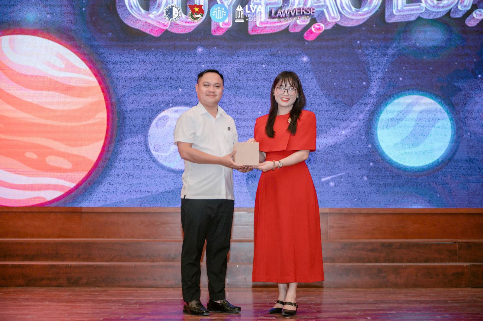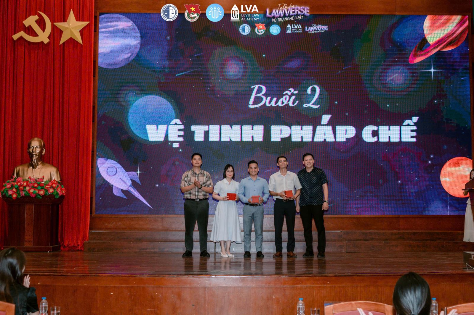 Đại diện Phòng Công tác sinh viên và Đoàn Thanh niên Trường Đại học Luật Hà Nội đã gửi những phần quà lưu niệm đến các diễn giả, luật sư.