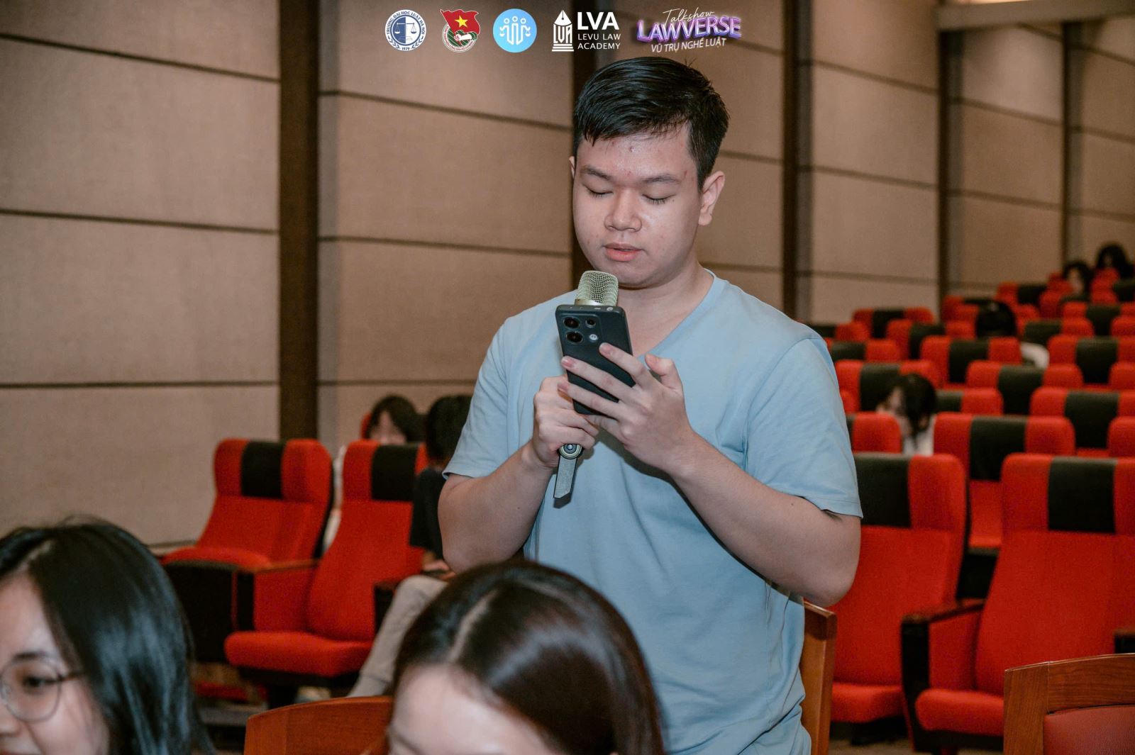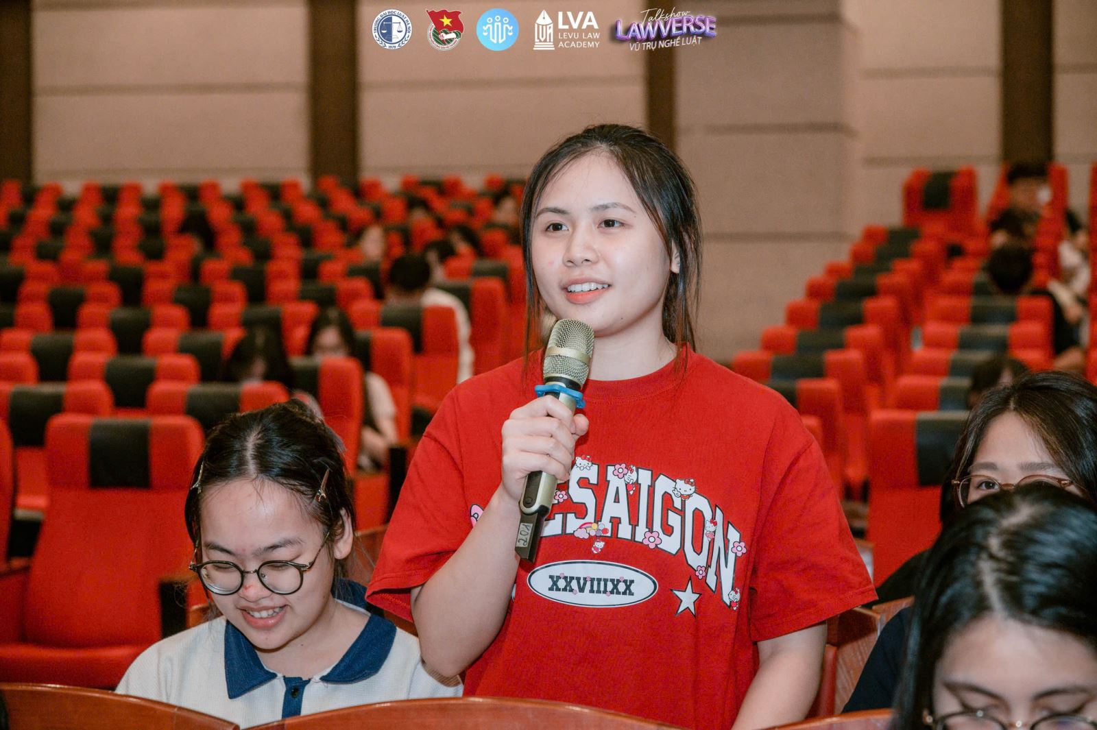 Các bạn sinh viên tích cực tương tác, đặt câu hỏi cho các vị diễn giả về các băn khoăn, thắc mắc của mình đối với con đường nghề nghiệp ngành luật.