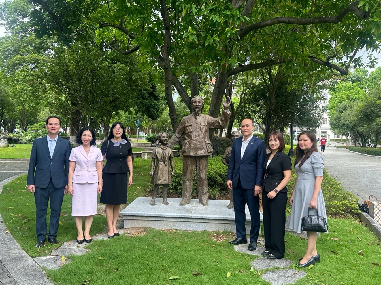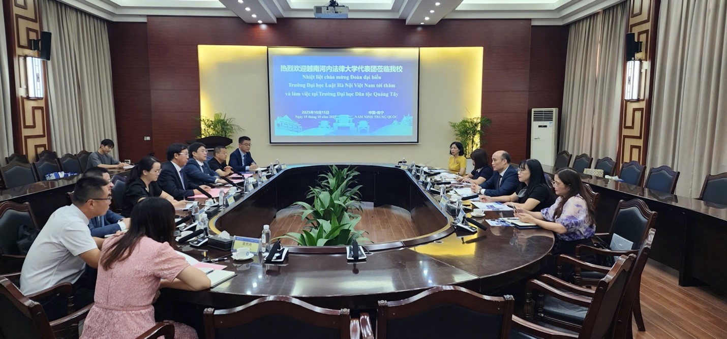 Chiều ngày 15/10/2025, Đoàn công tác có buổi làm việc tại Trường Đại học dân tộc Quảng Tây, là trường đại học trọng điểm do Ủy ban Dân tộc Quốc gia Trung Quốc và Chính quyền Khu tự trị dân tộc Choang Quảng Tây cùng xây dựng. Giáo sư Nguỵ Thời Trân - Hiệu trưởng Trường Đại học dân tộc Quảng Tây cùng các lãnh đạo chủ chốt của Trường đã có buổi trao đổi hiệu quả với đoàn công tác về kế hoạch và các hoạt động cụ thể để triển khai Thoả thuận hợp tác đào tạo và nghiên cứu khoa học giữa hai Trường được ký kết tháng 6/2025, bao gồm hợp tác đào tạo nhân tài pháp luật song bằng, trao đổi sinh viên và giảng viên, tổ chức Hội thảo khoa học quốc tế.