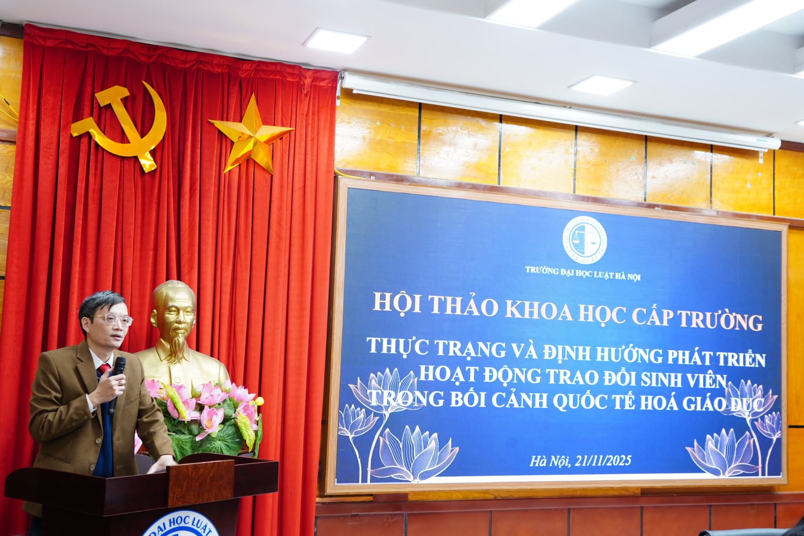 Ngày 21/11/2025, tại Hội trường A402, Trường Đại học Luật Hà Nội đã tổ chức thành công Hội thảo khoa học cấp Trường với chủ đề “Thực trạng và định hướng phát triển hoạt động trao đổi sinh viên trong bối cảnh quốc tế hoá giáo dục”. Hội thảo là một diễn đàn quan trọng nhằm đánh giá, định hướng và nâng cao hiệu quả chương trình trao đổi sinh viên – một nội dung trọng tâm trong chiến lược quốc tế hóa giáo dục của Nhà trường.