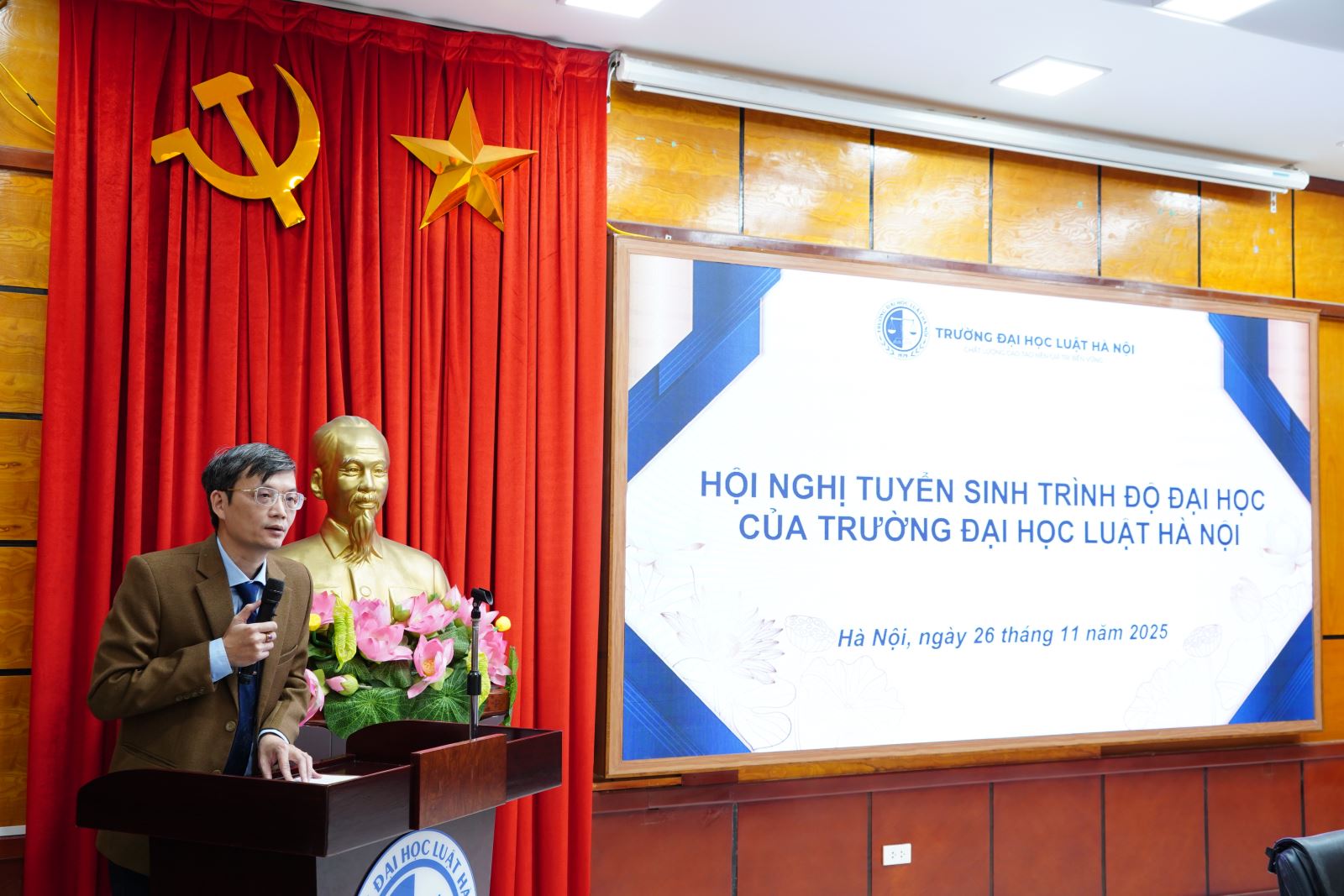 Phát biểu tại Hội nghị, PGS.TS Nguyễn Bá Bình, Phó Hiệu trưởng nhấn mạnh, trong bối cảnh đổi mới căn bản, toàn diện giáo dục đại học, sự cạnh tranh giữa các cơ sở đào tạo ngày càng gia tăng, cùng với yêu cầu chuyển đổi số và hội nhập quốc tế ngày càng sâu rộng, công tác tuyển sinh không chỉ là hoạt động mang tính kỹ thuật mà còn là hoạt động có tính định hướng chiến lược, quyết định tới chất lượng đầu vào và định hình các giá trị đào tạo của Nhà trường. Đặc biệt, trước yêu cầu hội nhập quốc tế sâu rộng, chuyển đổi số mạnh mẽ trong giáo dục và nhu cầu cấp thiết về nguồn nhân lực pháp lý chất lượng cao, công tác tuyển sinh trình độ đại học ngành luật càng đòi hỏi sự chủ động, linh hoạt và chuyên nghiệp hơn bao giờ hết.