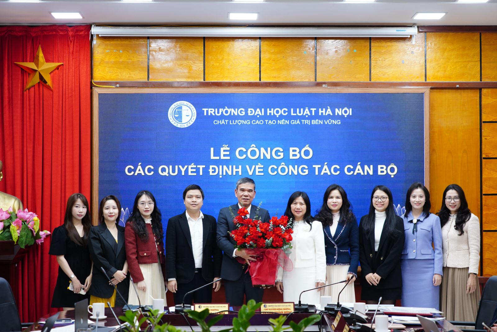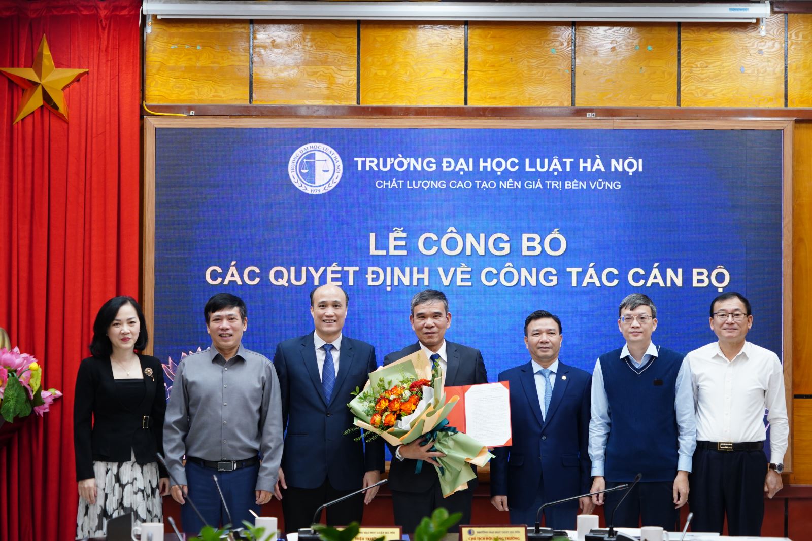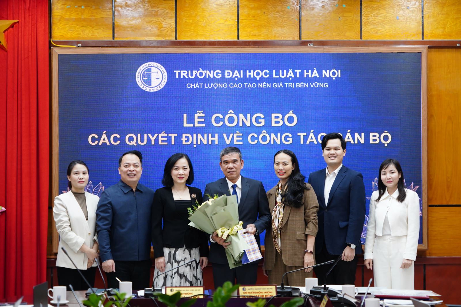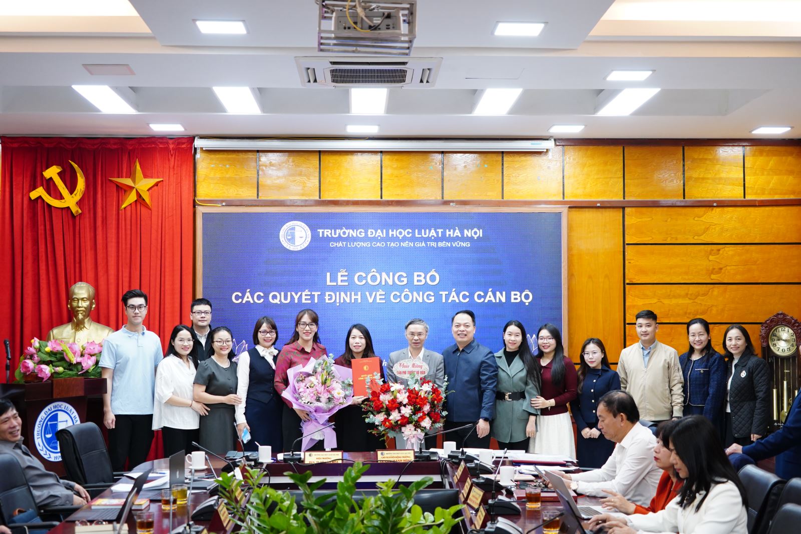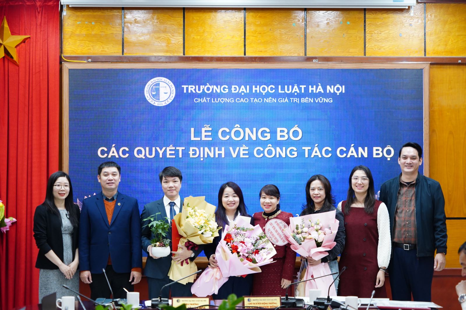 Mở đầu, ThS Trần Ngọc Định, Trưởng phòng Phòng Tổ chức - Hành chính đã công bố các Quyết định bổ nhiệm chức vụ Phó Trưởng phòng; Phó Trưởng Bộ môn. Theo đó, điều động ông Nguyễn Văn Hương, Trưởng khoa Khoa Đào tạo chuyên ngành thuộc Phân hiệu của Trường Đại học Luật Hà Nội đến công tác tại Phòng Đào tạo sau đại học và bổ nhiệm giữ chức vụ Phó Trưởng phòng Phòng Đào tạo sau đại học kề từ ngày 01/12/2025. Bổ nhiệm ông Nguyễn Đức Việt, Giảng viên Bộ môn Tư pháp quốc tế thuộc Khoa Pháp luật quốc tế giữ chức vụ Phó Trưởng bộ môn Bộ môn Tư pháp quốc tế thuộc Khoa Pháp luật quốc tế kể từ ngày 01/12/2025. Bổ nhiệm bà Mạc Thị Hoài Thương, Giảng viên chính Bộ môn Công pháp quốc tế thuộc Khoa Pháp luật quốc tế giữ chức vụ Phó Trưởng bộ môn Bộ môn Công pháp quốc tế thuộc Khoa Pháp luật quốc tế kể từ ngày 01/12/2025. Bổ nhiệm bà Lê Thị Giang, Giảng viên chính Bộ môn Luật dân sự thuộc Khoa Pháp luật dân sự giữ chức vụ Phó Trưởng bộ môn Bộ môn Luật Dân sự thuộc Khoa Pháp luật dân sự kể từ ngày 01/12/2025.