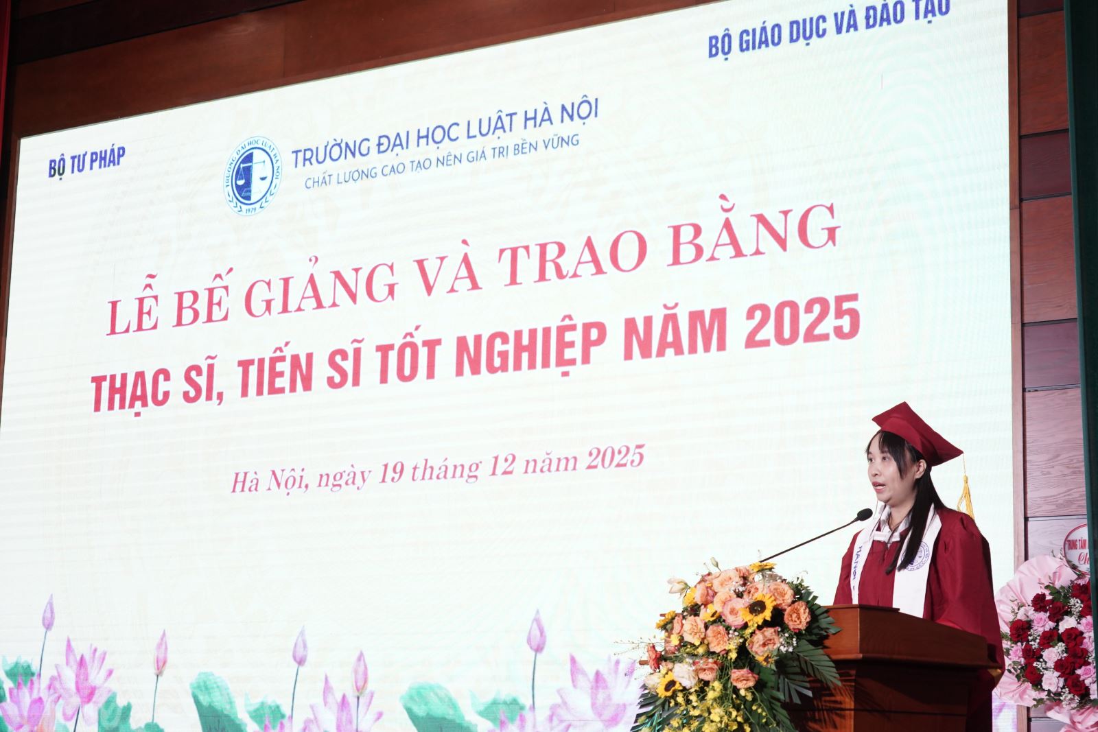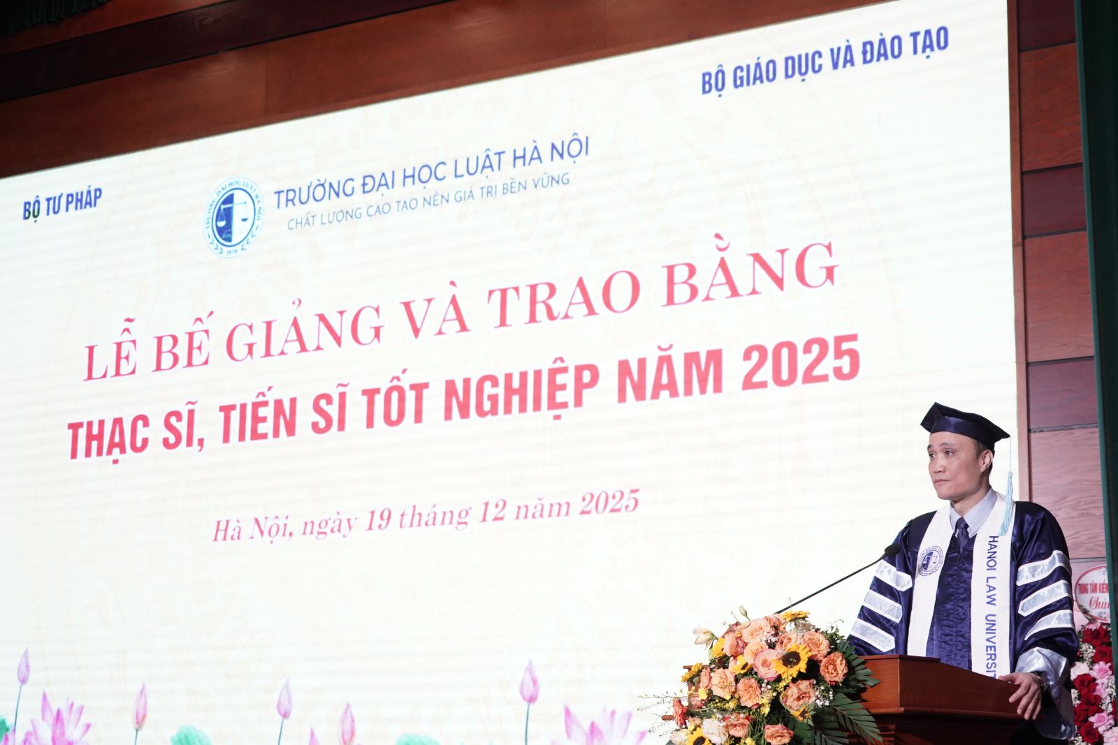 Hiệu trưởng lưu ý, chính từ thời điểm này, mỗi tân thạc sĩ, tân tiến sĩ sẽ là người trực tiếp khẳng định giá trị thực sự của văn bằng Trường Đại học Luật Hà Nội thông qua hành động, tư duy, thái độ nghề nghiệp và nhân cách khoa học trong thực tiễn công tác. Trình độ càng cao càng đòi hỏi sự khiêm nhường, thận trọng trong tư duy, khả năng tự phản biện và tinh thần học hỏi không ngừng. Trong khoa học pháp lý, tri thức luôn phải đi cùng với chiều sâu tư duy, sự cẩn trọng và trách nhiệm trong từng kết luận.
