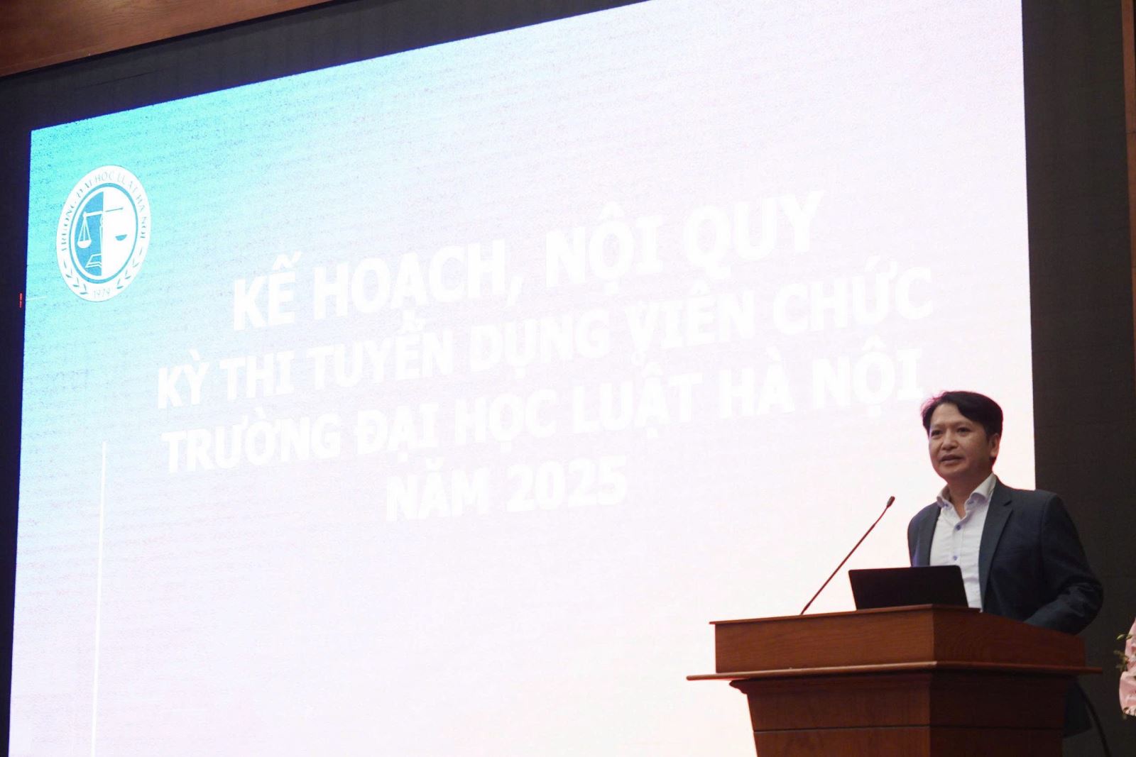 Để kỳ thi diễn ra nghiêm túc, đúng quy định và đạt chất lượng, Hiệu trưởng đề nghị Hội đồng tuyển dụng, các ban, tổ giúp việc thực hiện đầy đủ, nghiêm túc chức trách, nhiệm vụ được giao theo quy định của pháp luật; đồng thời yêu cầu các thí sinh chấp hành nghiêm nội quy, quy chế kỳ thi, phát huy tinh thần trách nhiệm và trung thực. Thay mặt Lãnh đạo Nhà trường, Hiệu trưởng tuyên bố khai mạc kỳ thi tuyển dụng viên chức năm 2025 của Trường Đại học Luật Hà Nội và chúc các thí sinh tự tin, nỗ lực đạt kết quả tốt, các thầy cô hoàn thành xuất sắc nhiệm vụ được giao.