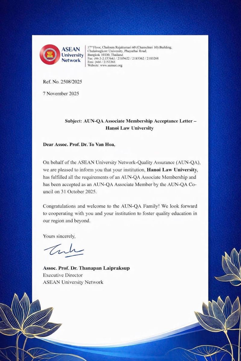 Trong thư gửi đến Trường ngày 07/11/2025, GS.TS. Thanapan Laipraksup – Giám đốc Điều hành AUN nhấn mạnh: “Chúng tôi vui mừng thông báo rằng Trường Đại học Luật Hà Nội đã đáp ứng toàn bộ điều kiện và chính thức trở thành thành viên liên kết của AUN-QA. Xin chúc mừng và chào mừng Trường gia nhập gia đình AUN-QA! Chúng tôi mong muốn hợp tác chặt chẽ với Trường nhằm thúc đẩy chất lượng giáo dục trong khu vực và xa hơn nữa.”
