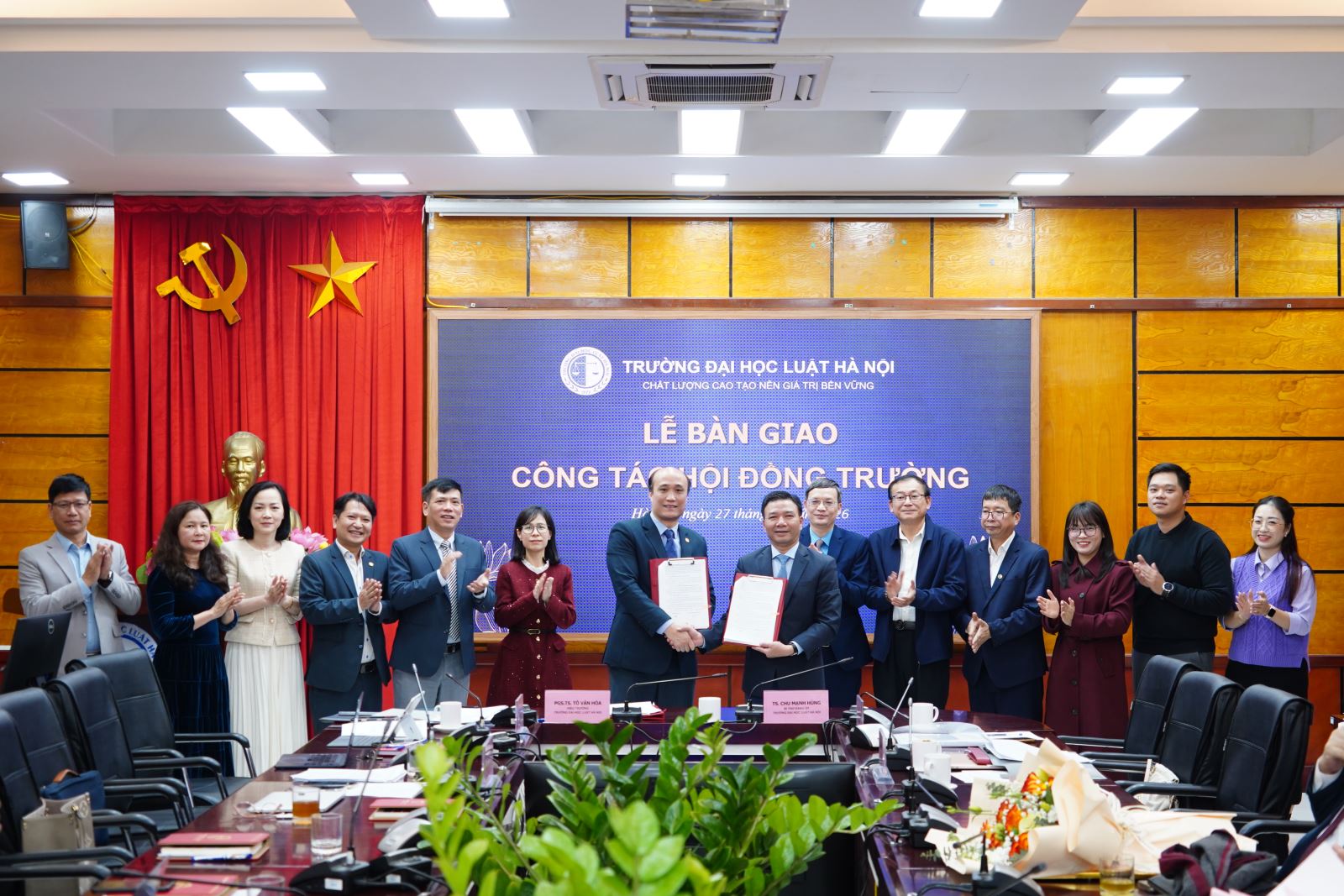 Thực hiện chủ trương đổi mới mô hình quản trị các cơ sở giáo dục đại học theo Nghị quyết số 71-NQ/TW ngày 22/8/2025 của Bộ Chính trị và Luật Giáo dục đại học sửa đổi năm 2025, sáng ngày 27/01/2025, Trường Đại học Luật Hà Nội đã tổ chức Lễ bàn giao công tác Hội đồng trường. Đây là hoạt động có ý nghĩa quan trọng, nhằm bảo đảm tính kế thừa, liên tục trong công tác quản trị Nhà trường, đồng thời thực hiện nghiêm túc các quy định về quản lý, lưu trữ và bàn giao hồ sơ, tài liệu.