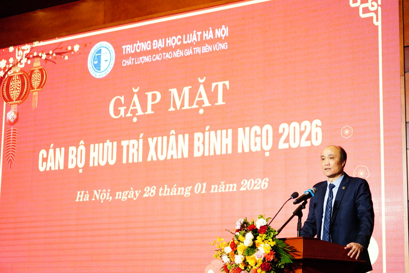 Trong buổi gặp mặt, Hiệu trưởng Tô Văn Hòa đã báo cáo những kết quả nổi bật của Trường Đại học Luật Hà Nội trong năm 2025 và phương hướng, nhiệm vụ năm 2026. Năm 2025 vừa qua là một năm có ý nghĩa đặc biệt quan trọng, đánh dấu những bước chuyển mình mạnh mẽ trong công tác tổ chức và hoạt động của Nhà trường, cùng với hệ thống chính trị Nhà trường hoàn thiện thể chế, sắp xếp tinh gọn cơ cấu, tổ chức bộ máy.