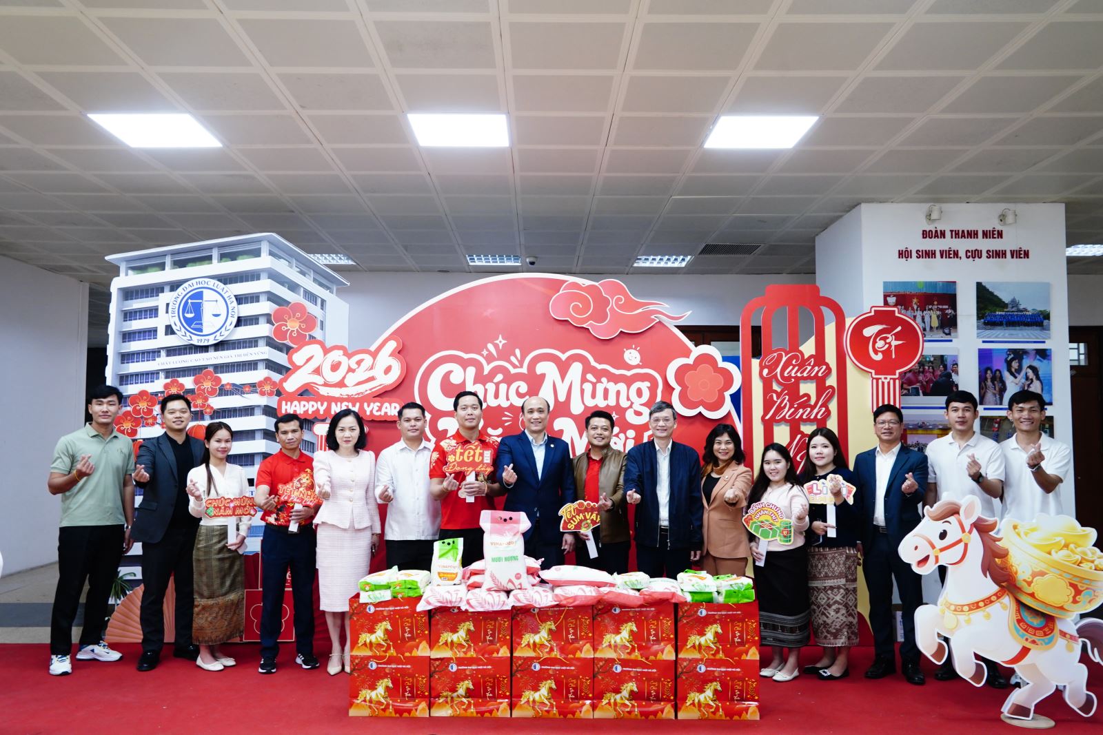 Đại diện lãnh đạo Nhà trường và lãnh đạo các đơn vị trao quà Tết tới các lưu học sinh.