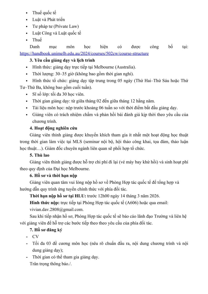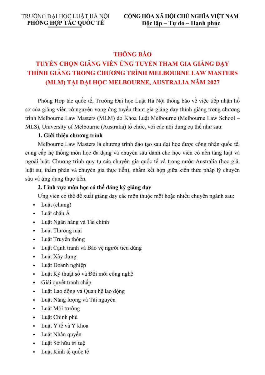 THÔNG BÁO TUYỂN CHỌN GIẢNG VIÊN ỨNG TUYỂN THAM GIA GIẢNG DẠY THỈNH GIẢNG TRONG CHƯƠNG TRÌNH MELBOURNE LAW MASTERS (MLM) TẠI ĐẠI HỌC MELBOURNE, AUSTRALIA NĂM 2027