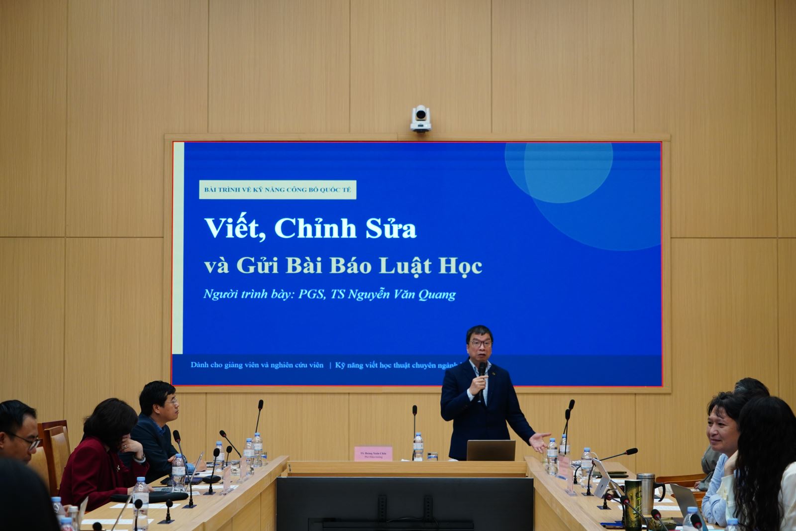 Tiếp đó, PGS.TS. Nguyễn Văn Quang đã trình bày báo cáo tới giảng viên và nghiên cứu viên về quy trình viết, chỉnh sửa và gửi bài báo luật học.