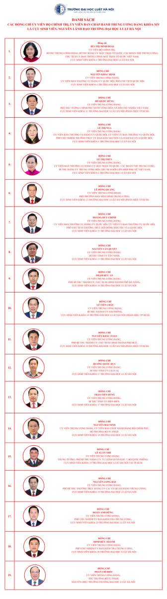 DANH SÁCH CÁC ĐỒNG CHÍ ỦY VIÊN BỘ CHÍNH TRỊ, ỦY VIÊN BAN CHẤP HÀNH TRUNG ƯƠNG ĐẢNG KHÓA XIV LÀ CỰU SINH VIÊN, NGUYÊN LÃNH ĐẠO TRƯỜNG ĐẠI HỌC LUẬT HÀ NỘI: TẠI ĐÂY